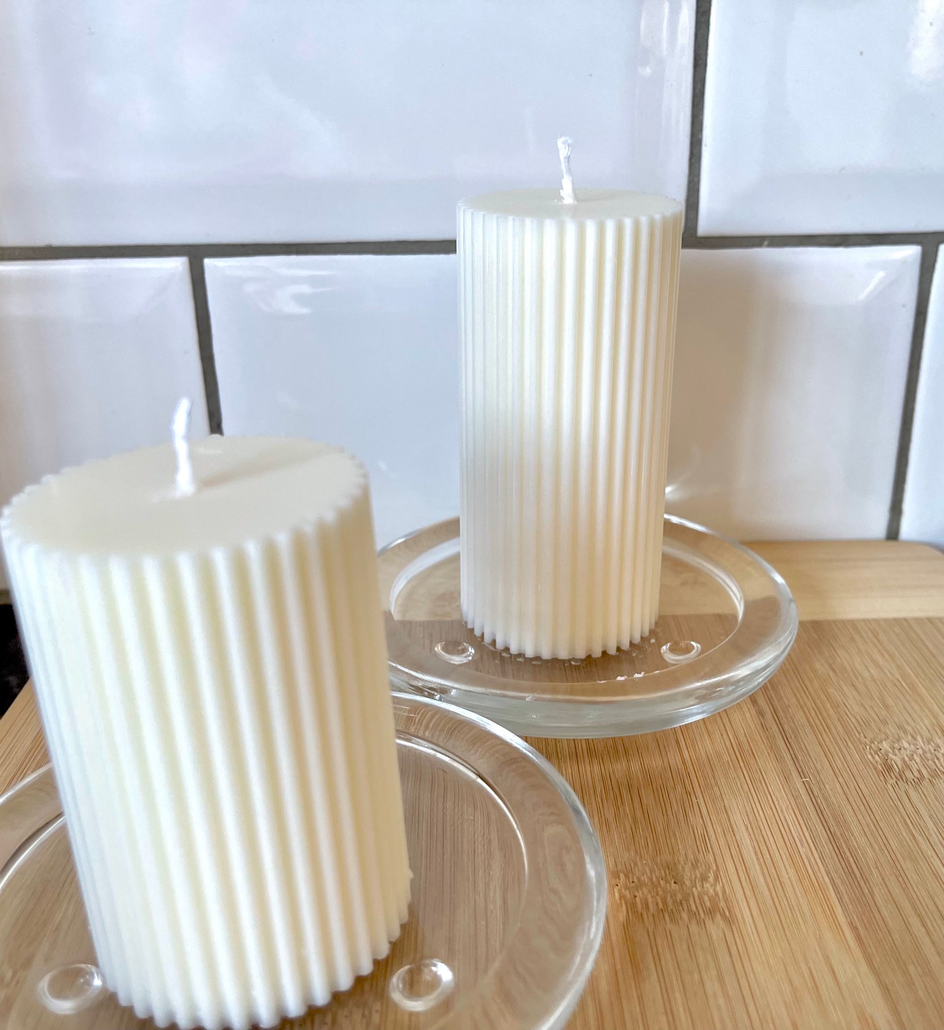 Unscented Handmade ribbed pillar candles.